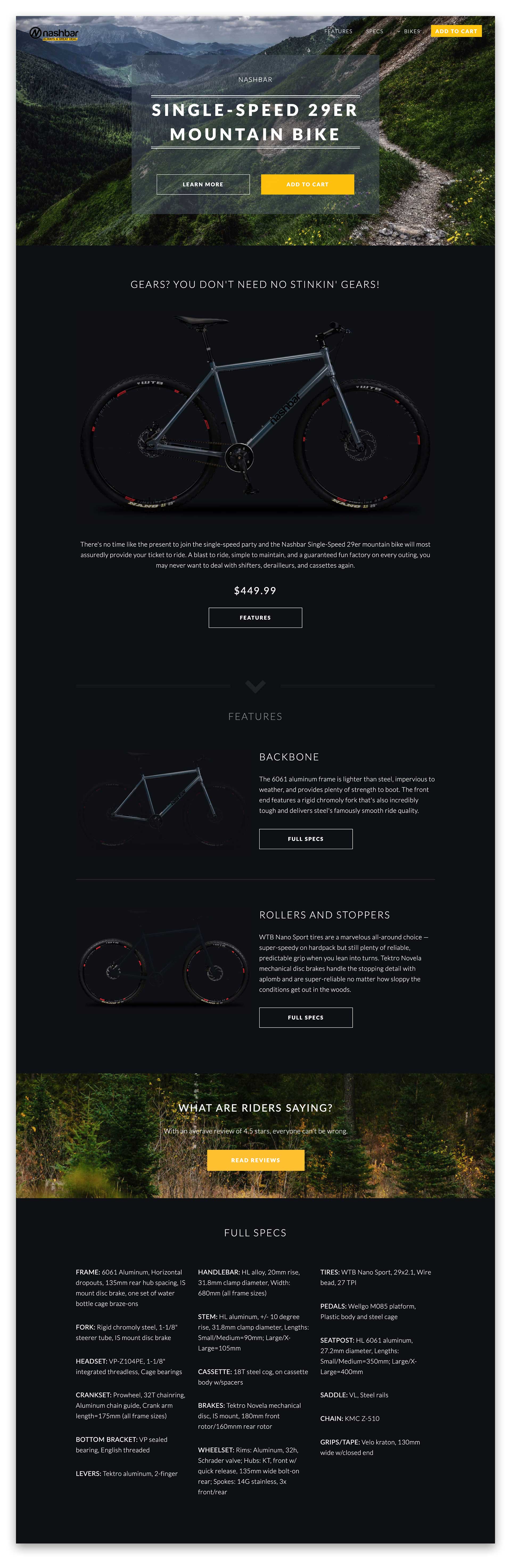 Single speed mountain bikes aren't reserved just for the hard core. With this microsite, nashbar aimed their entry level bike at the casual rider looking to break into single speed riding without intimidation of skill or price.