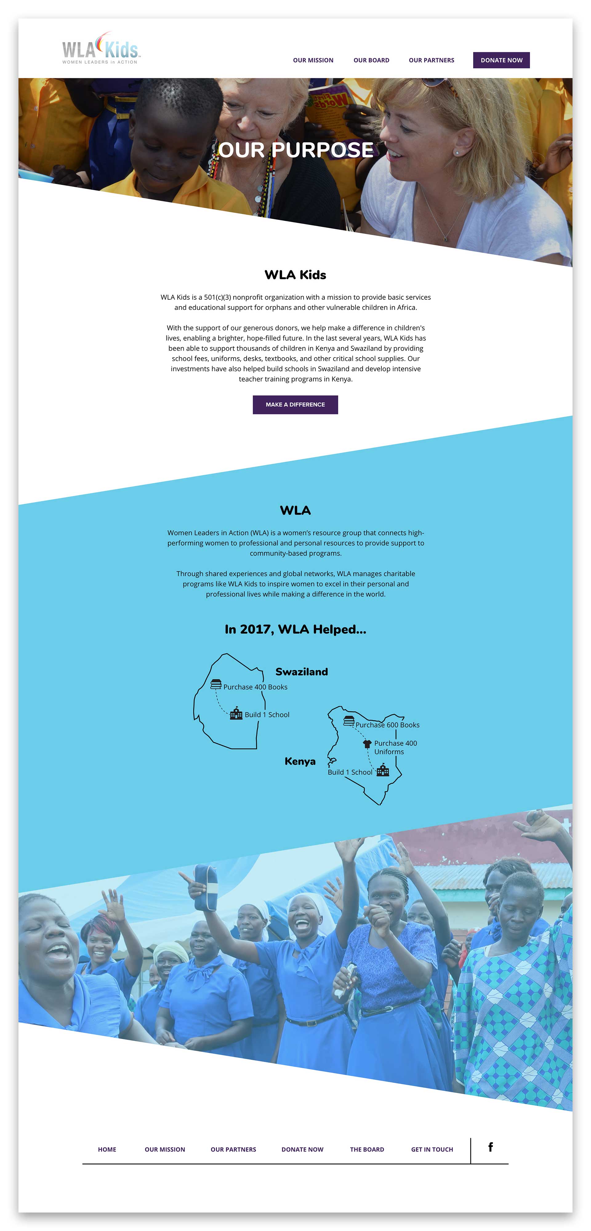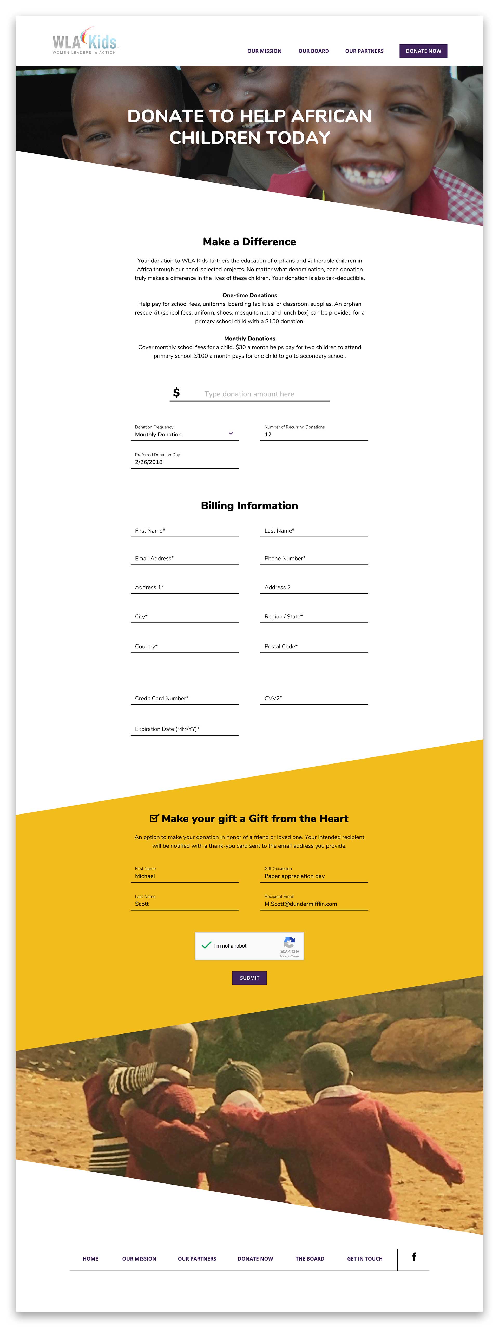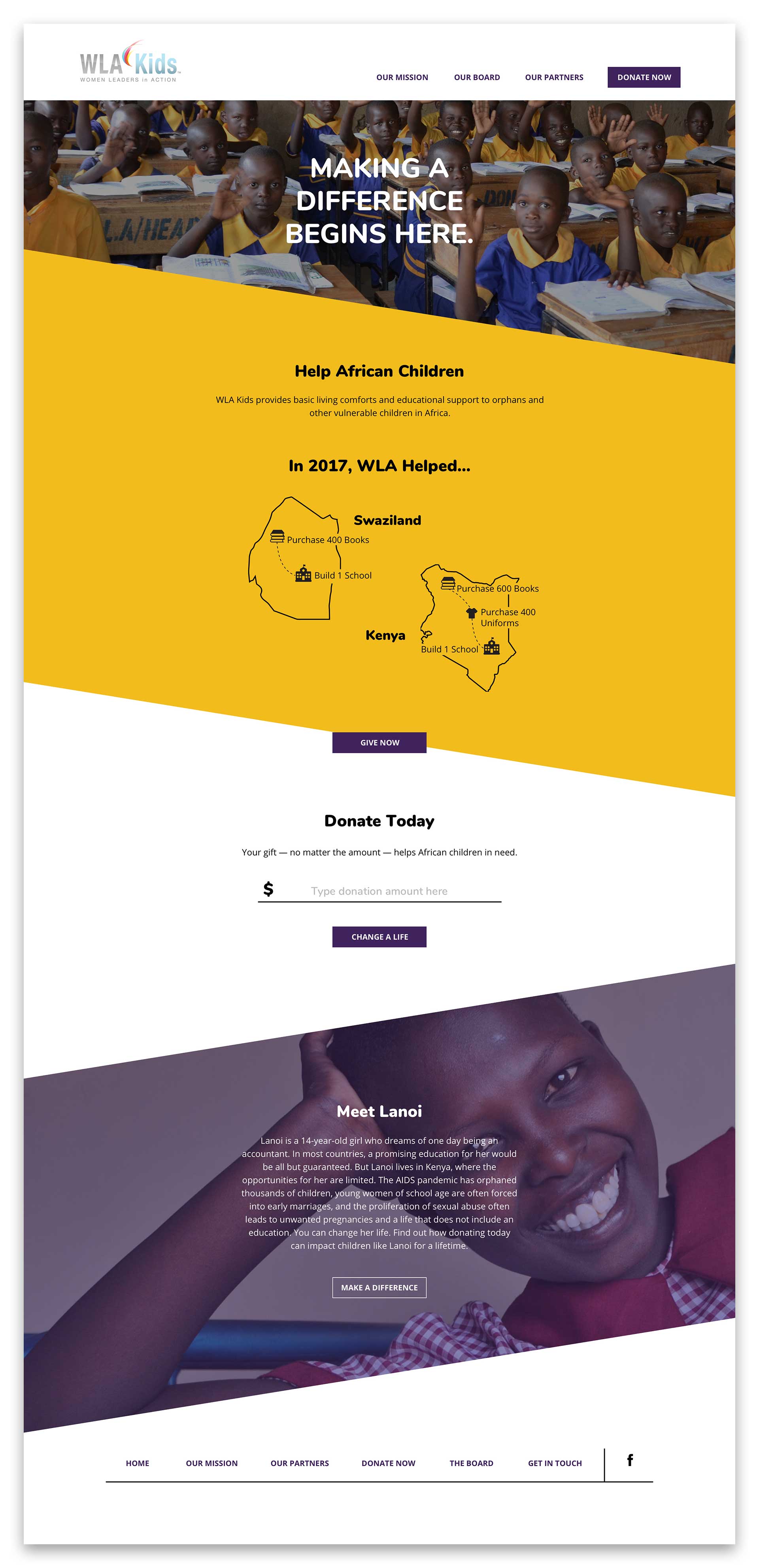Using supplied images and an inspired color palette, I designed the donor-friendly UI and UX for this site.